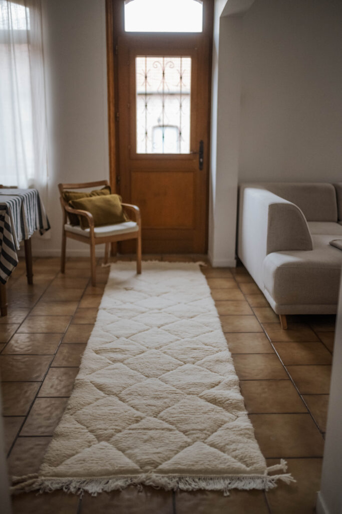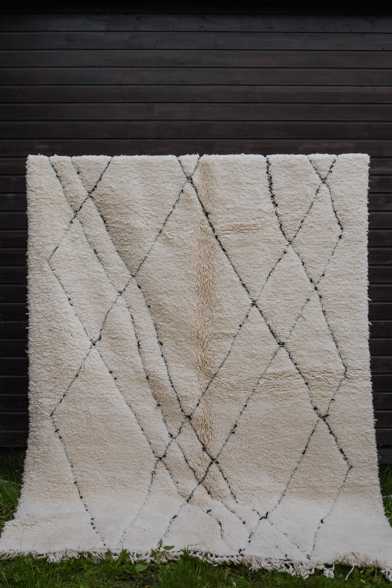 Ce tapis Béni Ouarain écru en laine naturelle associe des motifs graphiques noirs irréguliers, créant une ambiance contemporaine et raffinée.