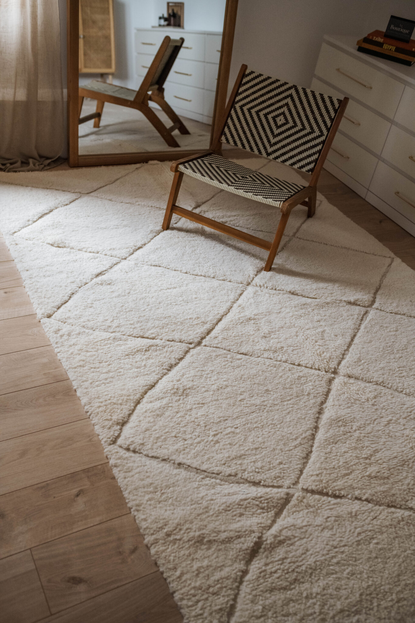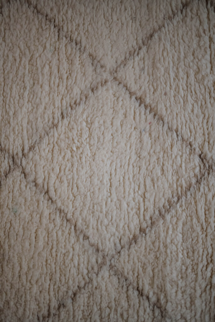 Ce tapis Béni Ouarain écru tissé à la main met en valeur sa forme losange et ses lignes brodées ton sur ton, créant une ambiance raffinée et graphique.