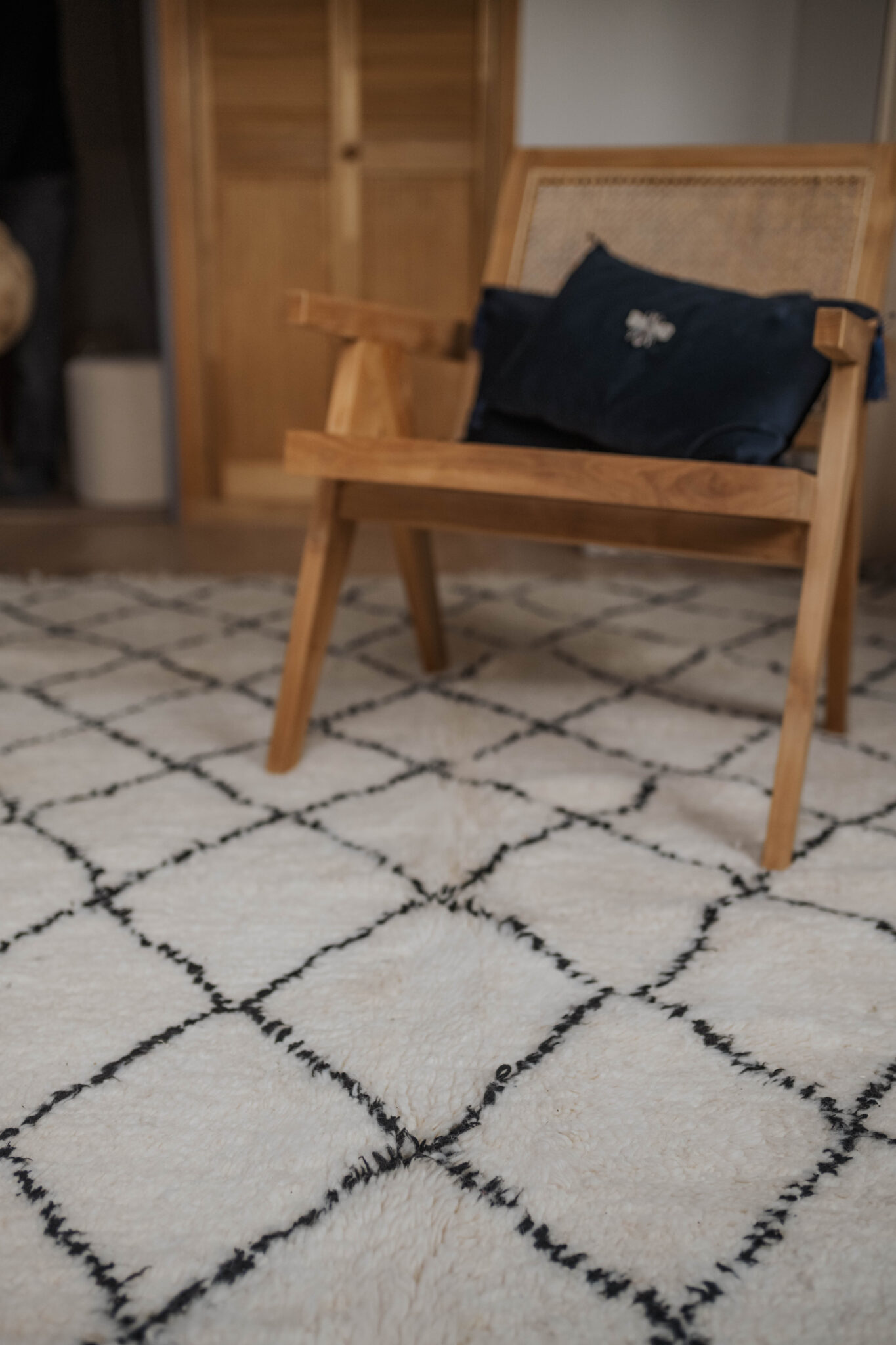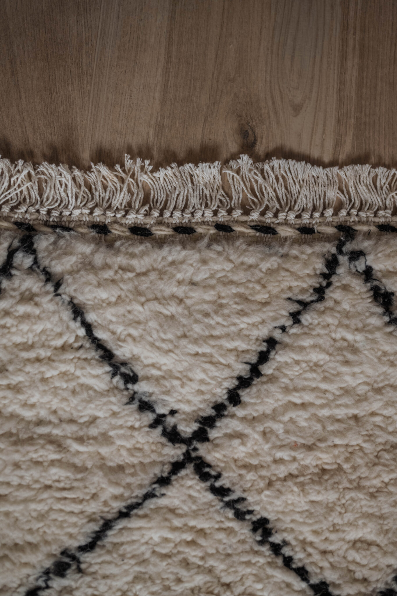Épuré et graphique, ce tapis berbère Béni Ouarain blanc se distingue par ses losanges soulignés de lignes noires.