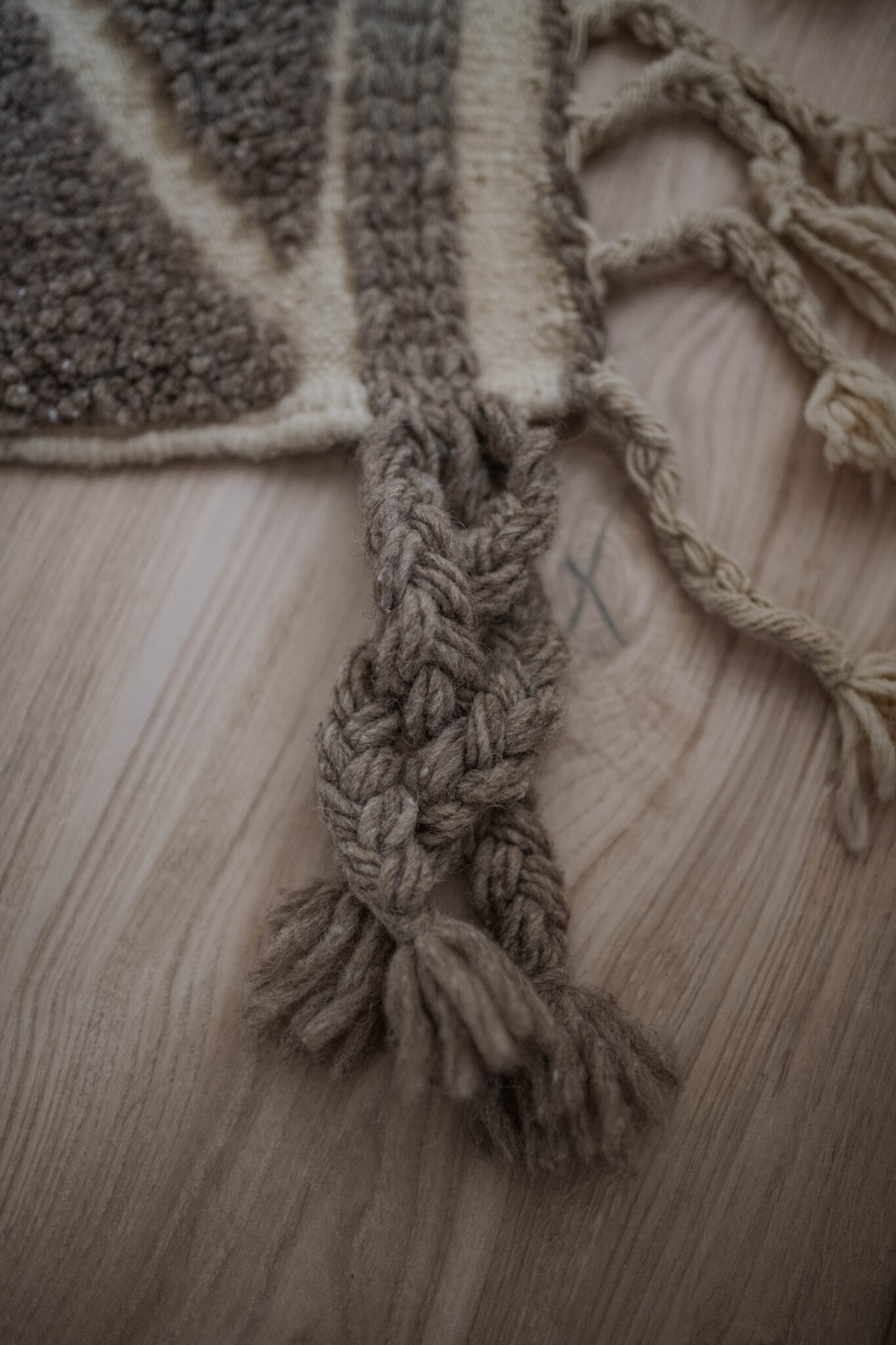 Son fond gris clair est rehaussé de lignes brodées blanches au design épuré. Les franges apportent une finition authentique, idéal pour une décoration moderne ou bohème.