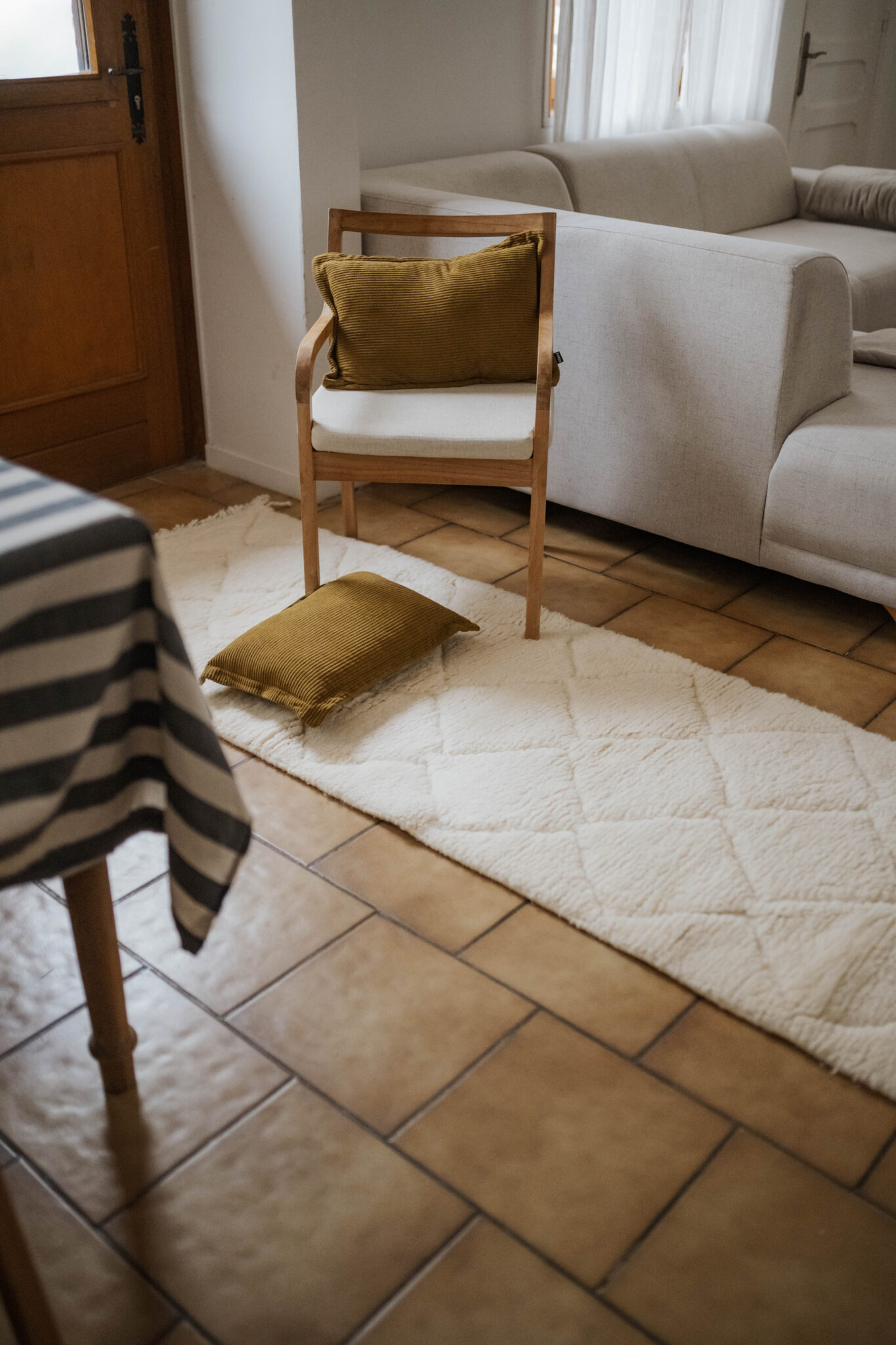 Ce tapis de couloir Beni Ouarain, en laine naturelle présente un fond écru dessiné de losanges ton sur ton, pour un rendu subtil et raffiné. Une pièce artisanale parfaite pour structurer un couloir ou une entrée avec élégance.